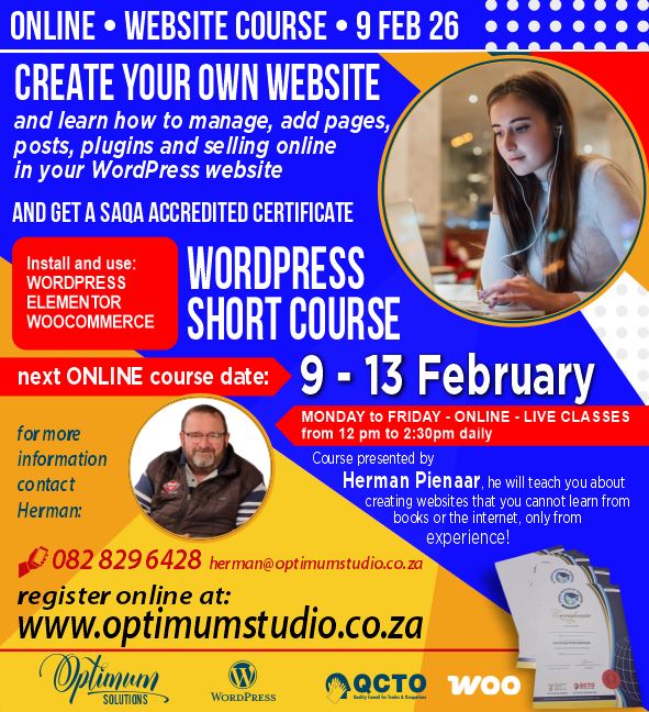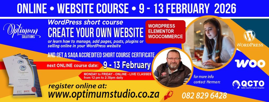 In short, once you have completed the short course, you will be able select your domain, register your website on cPanel on your own website, build a WordPress website (including an online shop) and then maintain your web site.